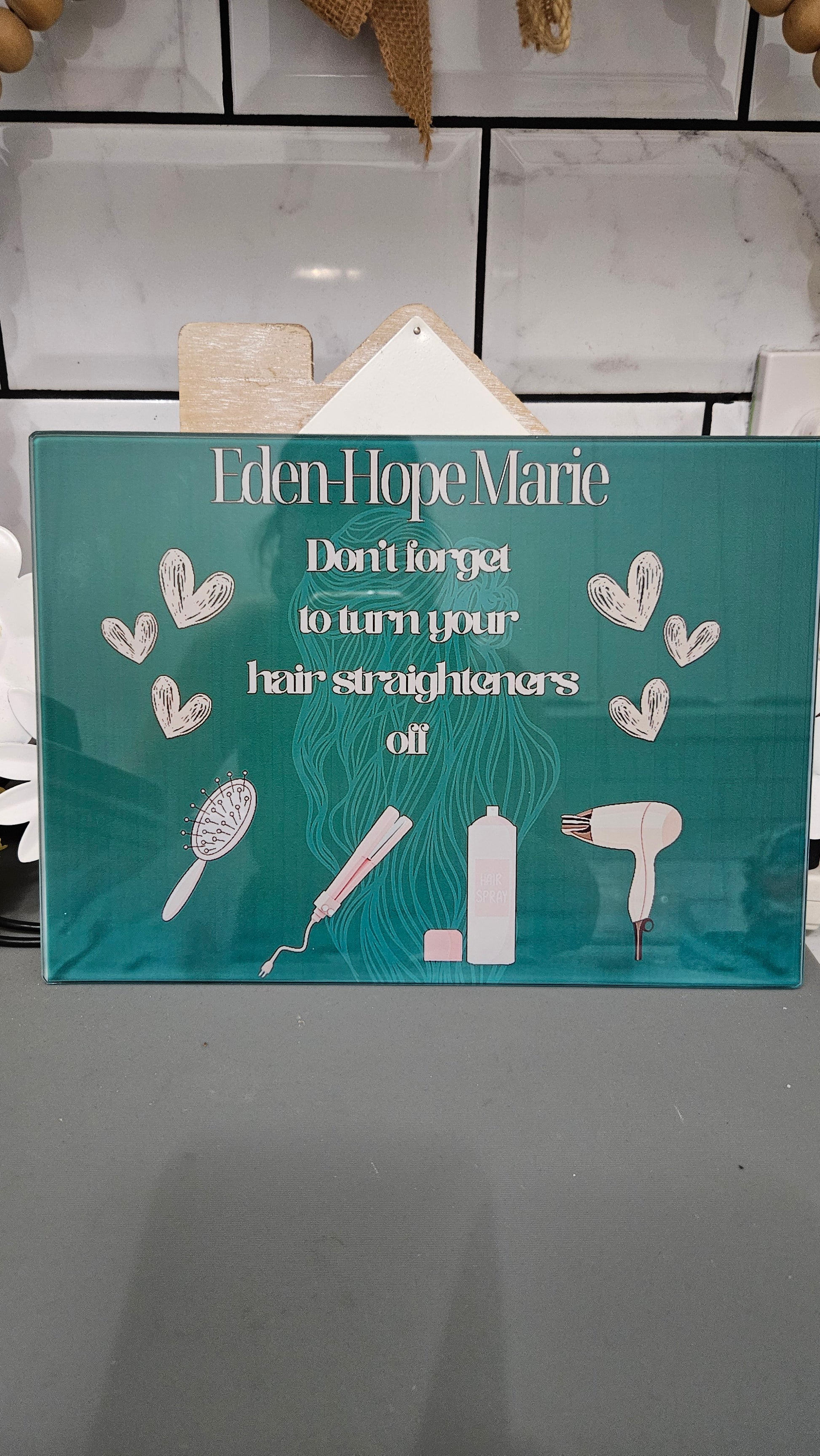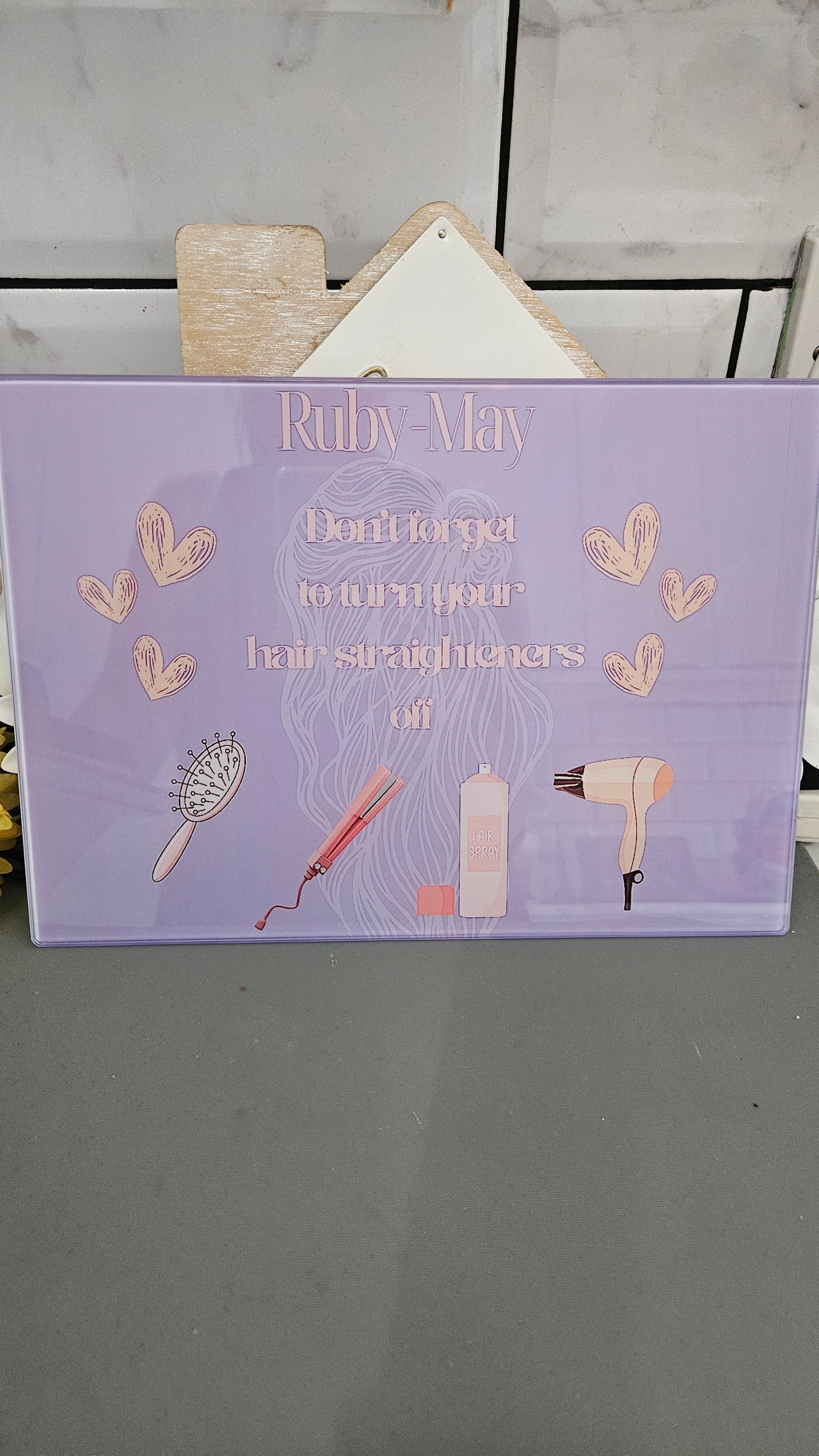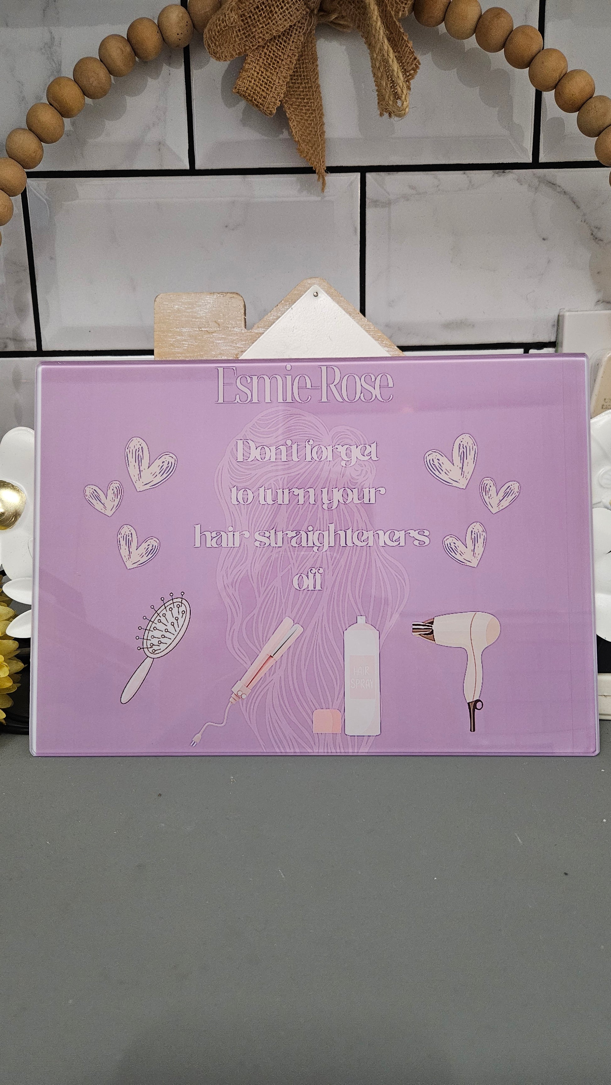 Keep your surfaces safe and your daughter's hair straighteners in check with our heat resistant boards. Say goodbye to worrying about damage or accidentally leaving them on with our friendly reminder. You can also choose your own colours for the background and wording giving it a personalised touch.